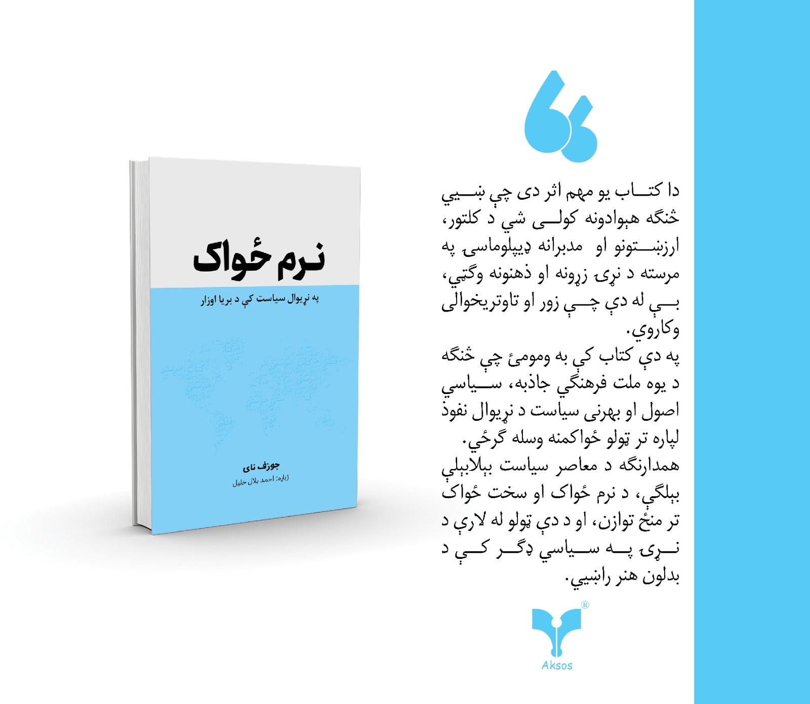 د نړیوالو اړیکو په ډګر کې د نړۍ یو له تر ټولو ډېر حواله شوي کتابونو څخه، د امریکايي سیاستپوه او پروفیسور جوزف نای شهکار اثر”نرم ځواک” په پښتو ژبه د اکسوس خپرندویې ټولنې له لوري په کابل کې چاپ او خپور شو.